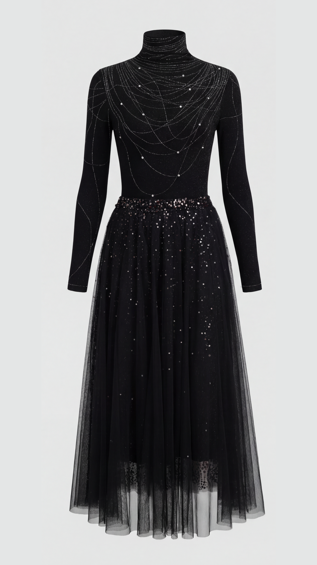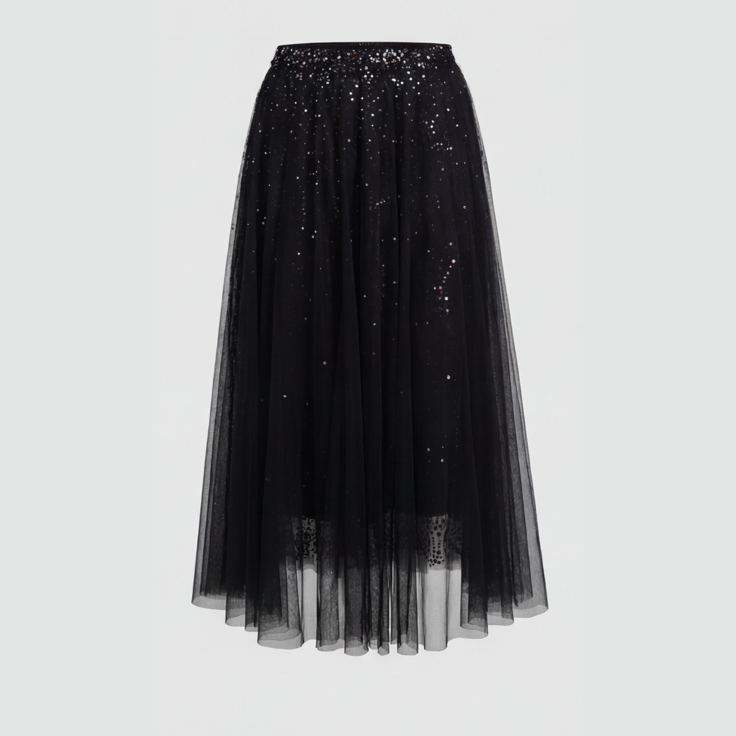 Model wearing Solelegia black glitter gauze A-line skirt, elegant women’s party and evening outfit