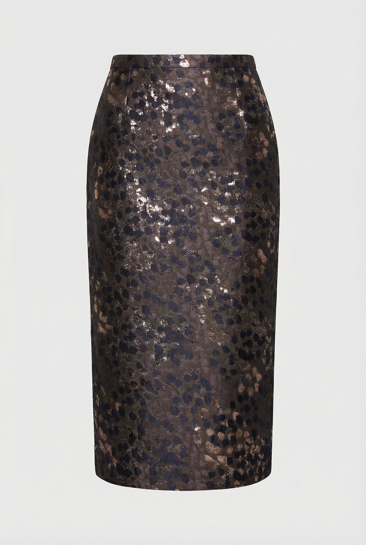 Made from rich jacquard fabric, this brown straight skirt showcases intricate woven patterns with a textured finish. Perfect for office settings, formal gatherings, or elegant daytime events where classic sophistication is key.