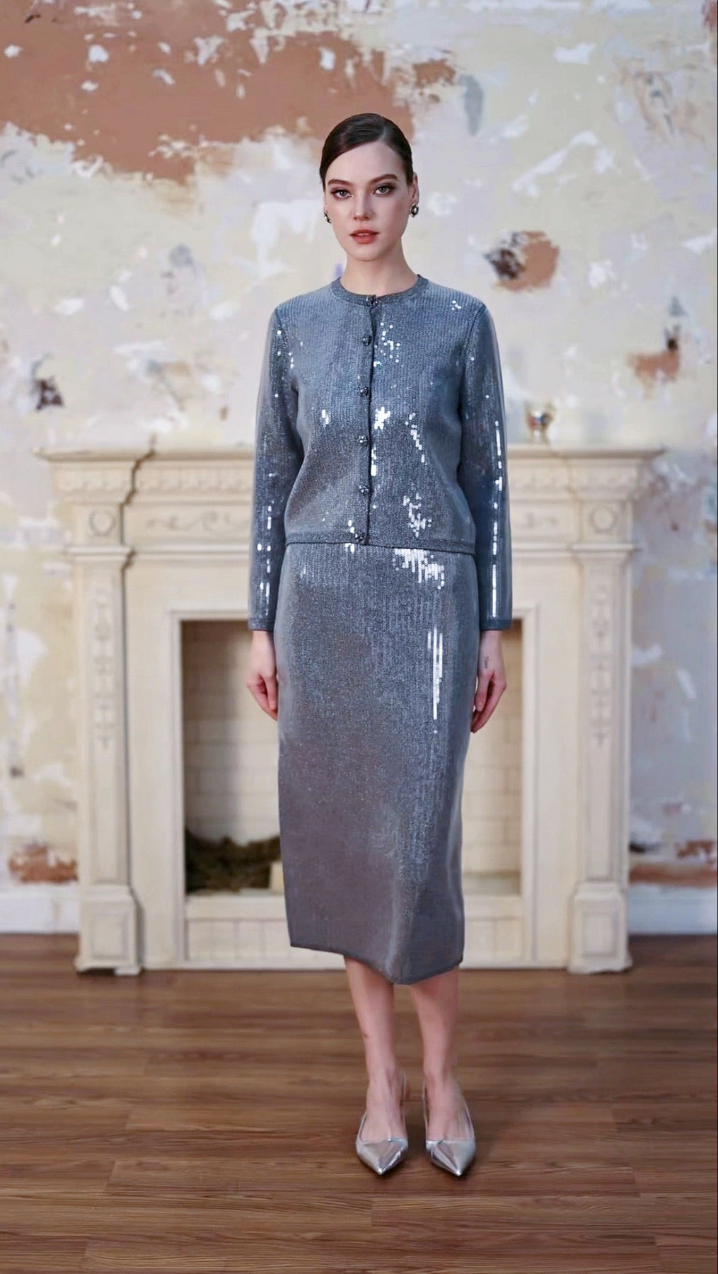 Solelegia grey-toned wool cardigan intricately woven with sheer sequins. Featuring a short, round-neck silhouette with a single-button closure, it is fully embellished with evenly set transparent sequins—offering both everyday wearability and a subtle, starry shimmer that effortlessly elevates any outfit.