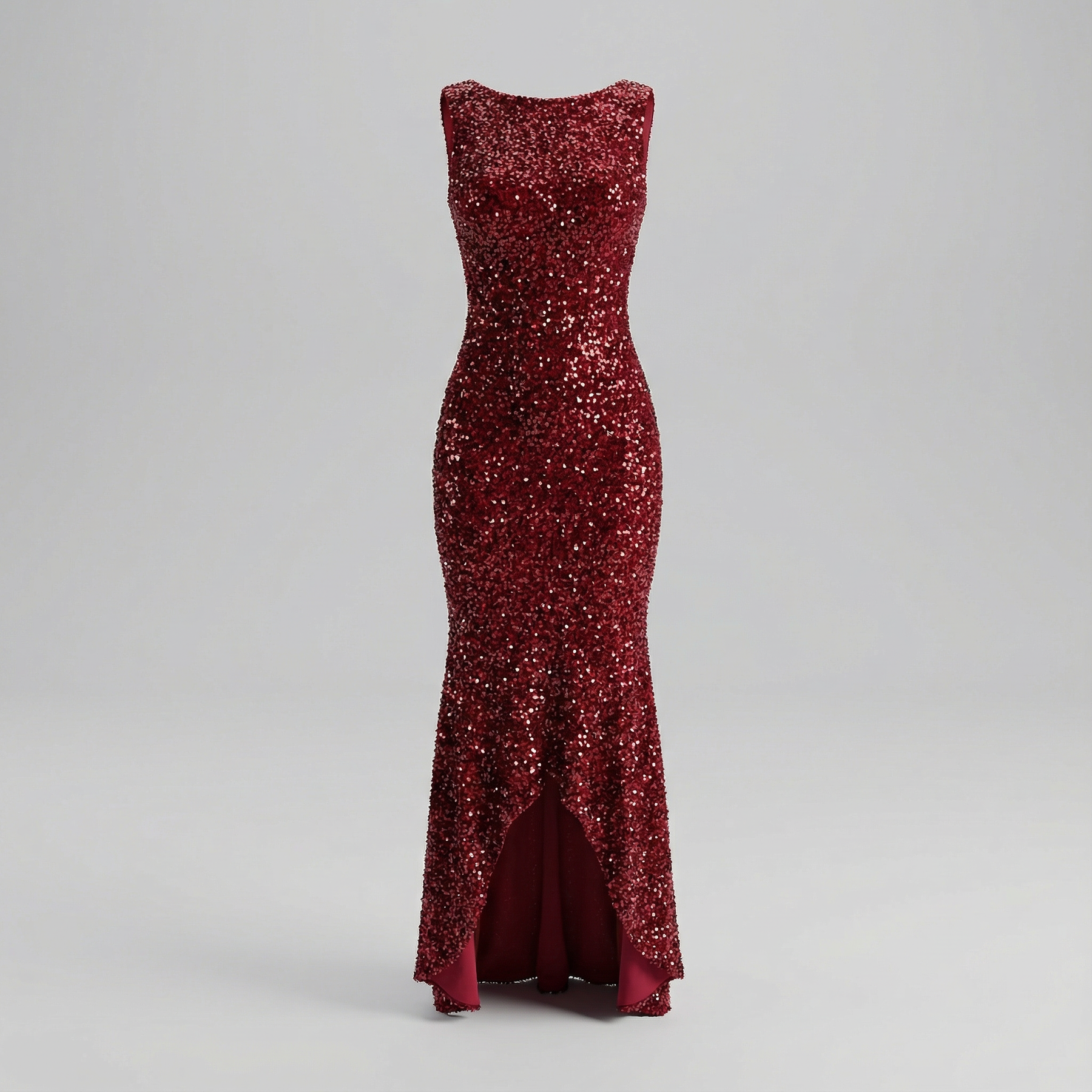 Red sequin mermaid gown fully embellished with fine shimmering sequins, featuring a fitted silhouette and a sleek side slit—designed to stand out at festive holiday occasions.
