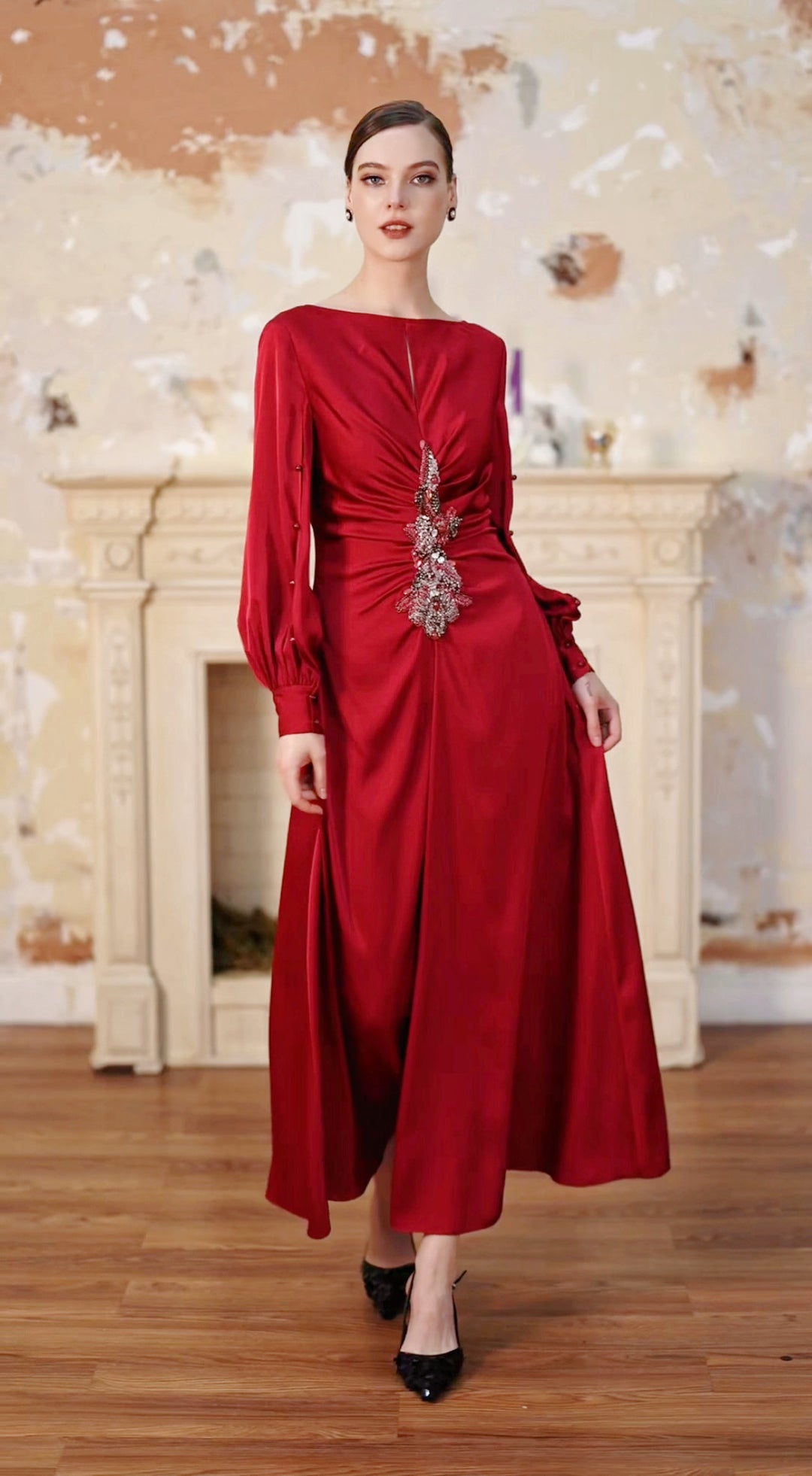 Puff-sleeved Pleated Waist Beading Maxi Party Dress
