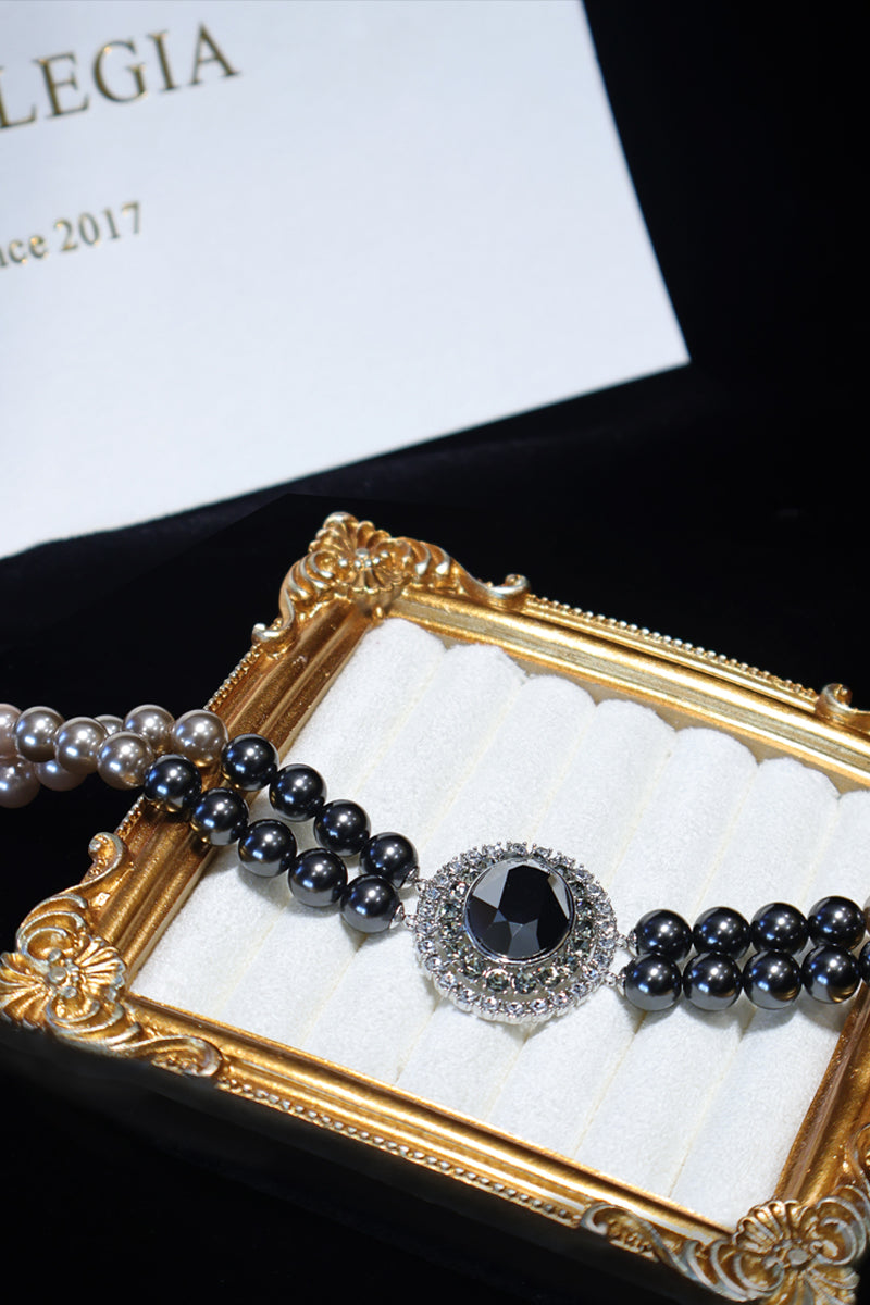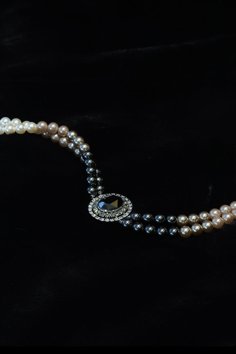 At the center sits a sharply cut black gemstone encircled by delicate shimmering stones, echoing the quiet glow of stars emerging at twilight. The pearls vary in spacing and color, balancing warmth and coolness for a look that is soft yet striking.
