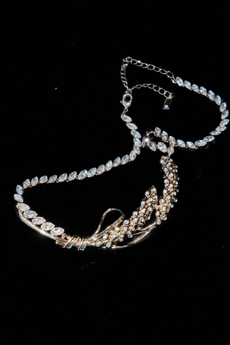 The crystal chain hugs the neckline to highlight its natural contours, while the three-dimensional feather element subtly elongates the shoulder and neck line—adding elegance while optimizing proportions.