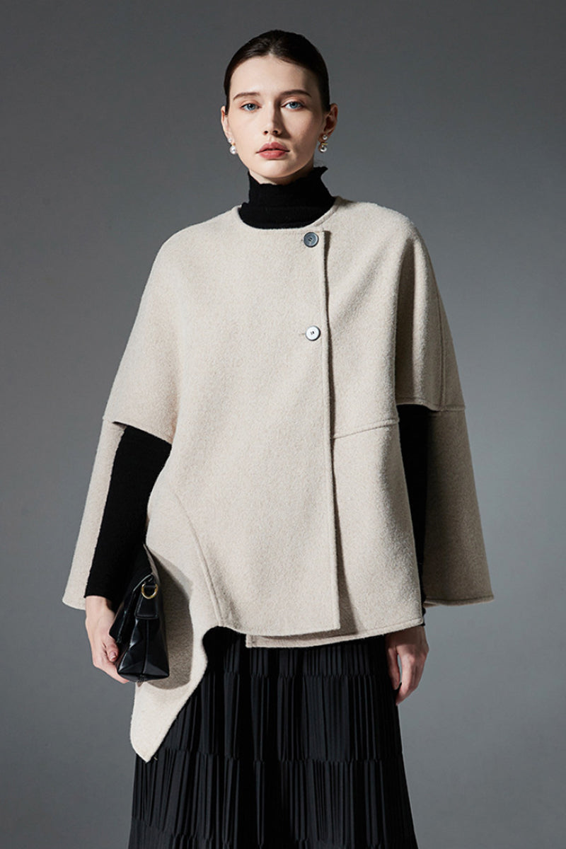 Asymmetric Double-Faced Wool Cape with Button Closure