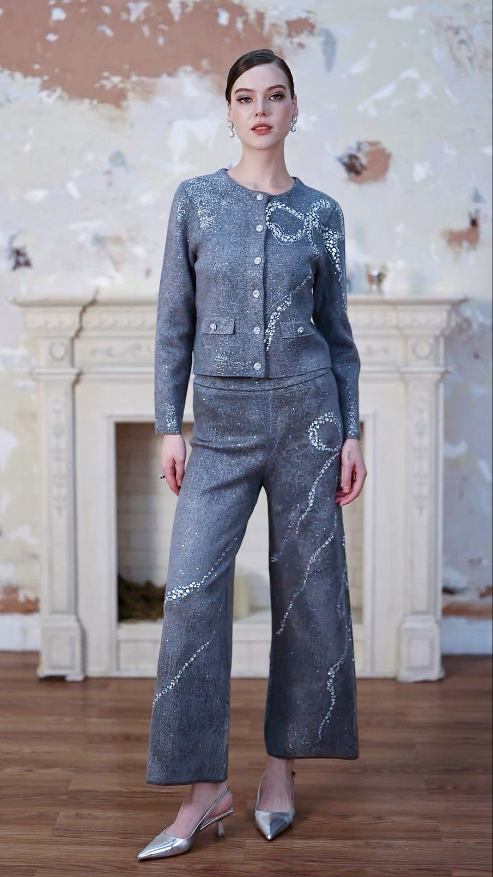 Diamond-Embellished Bow Slim Fit Gray High Waist Trouser