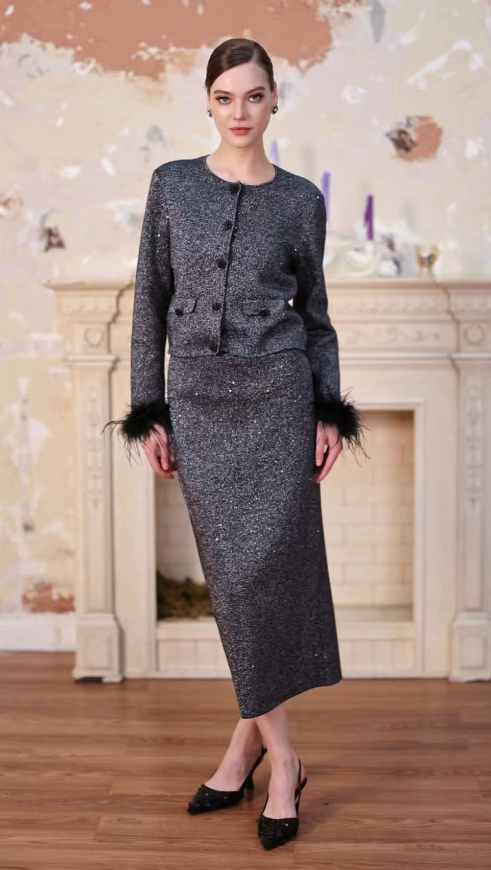 - Feather-trimmed cuffs