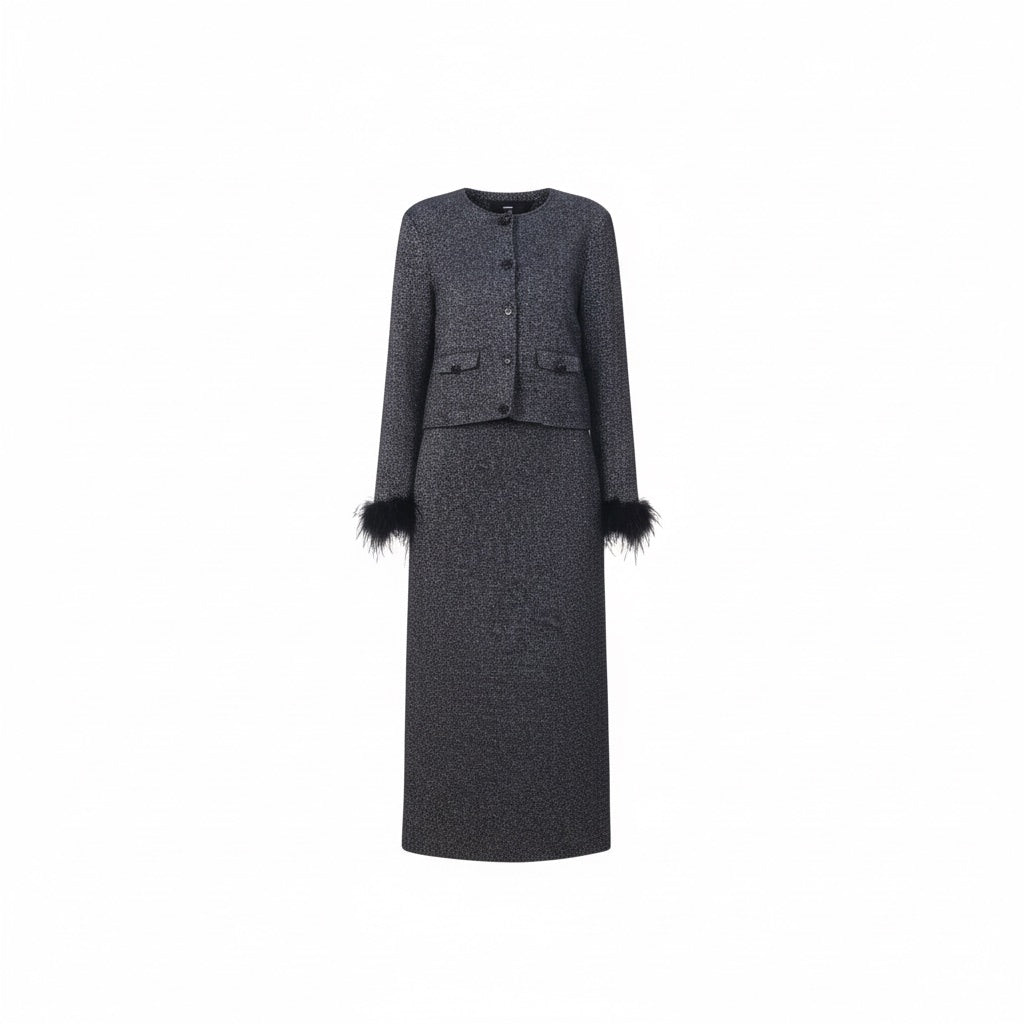 A luxurious knit top inspired by a starry meteor shower, crafted from premium Australian Merino wool and Japanese metallic yarn through high-density double-layer knitting. Adorned with a profusion of shimmering crystals in varying sizes and feather-trimmed cuffs, it transitions seamlessly from office wear to evening glamour.