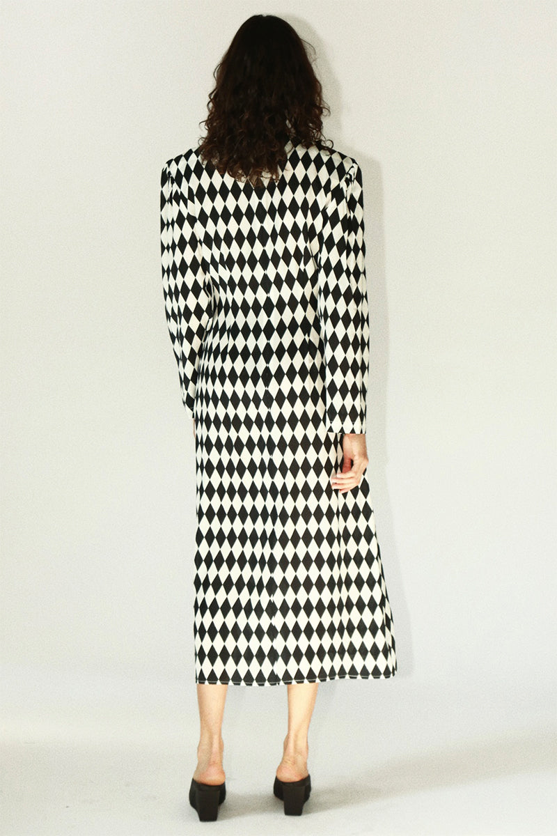 The check pattern visually refines the silhouette: still like a modern chessboard, fluid like moving geometry when in motion. The minimalist tailoring philosophy shapes every line — a round neckline with bias cut for comfort, tapered sleeves extending to the wrist, and a straight silhouette with hidden side darts to trace natural curves.