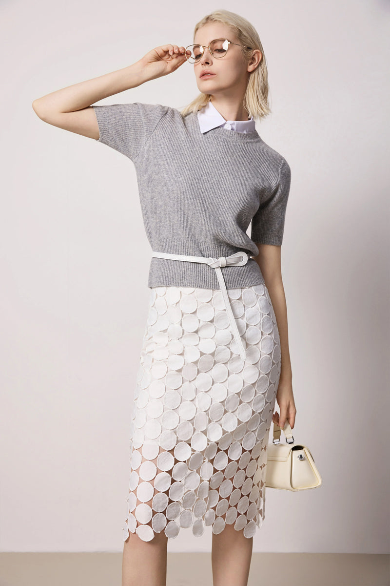 This white skirt features delicate hollow-out detailing and a subtly slim straight silhouette. Combining feminine texture with a flattering fit, it’s perfect for polished, elegant looks.