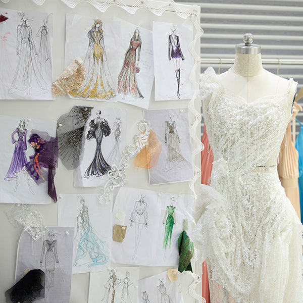 Our exquisite embellishments — delicate embroidery, refined sequins, exceptional feathers — are meticulously sourced from around the world and applied by hand according to the traditions of Parisian haute couture.